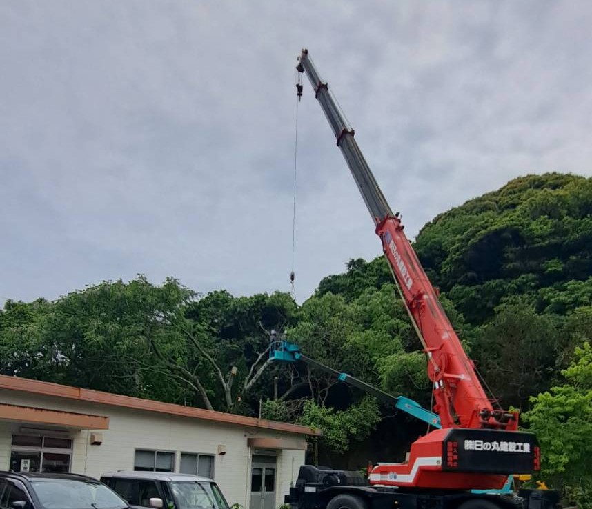 写真の大木は、長年の成長により幹が道路側へ大きく傾いた状態で育っており、枝葉も道路上へ張り出していました。このまま放置すると、台風や強風、大雨などの影響で倒木や枝折れが発生する恐れがあり、通行人や車両に被害が及ぶ危険性がありました。