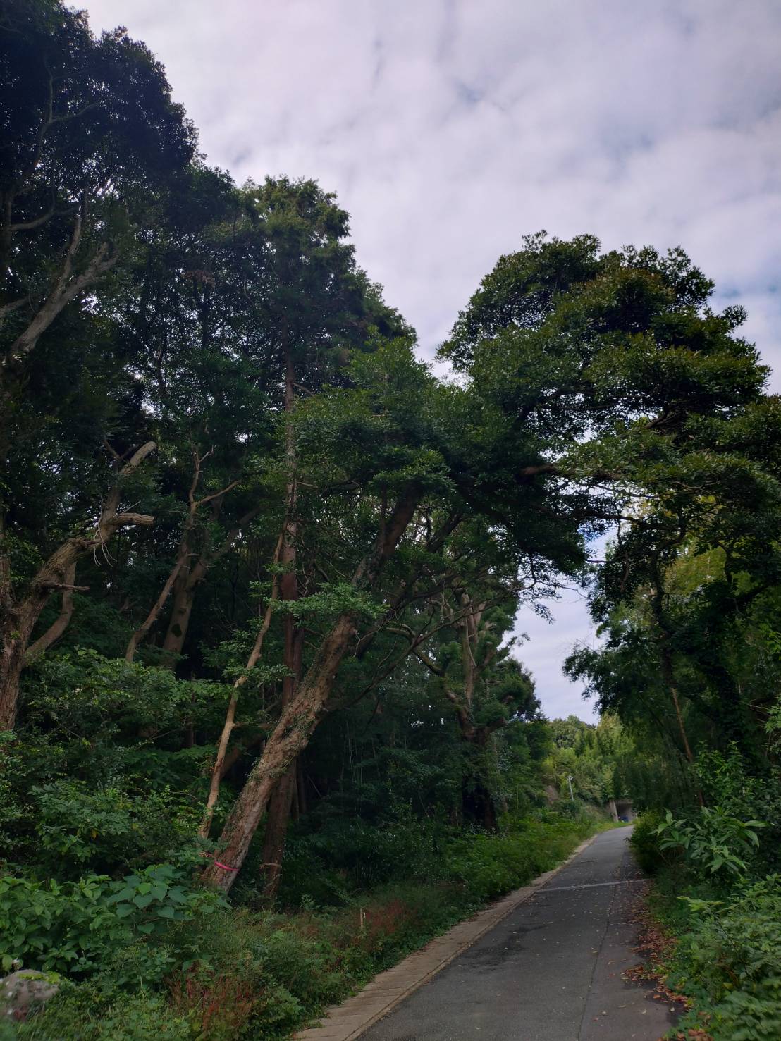 傾いた大木は道路にアーチをかけるように道路側に広く枝を伸ばしていました。